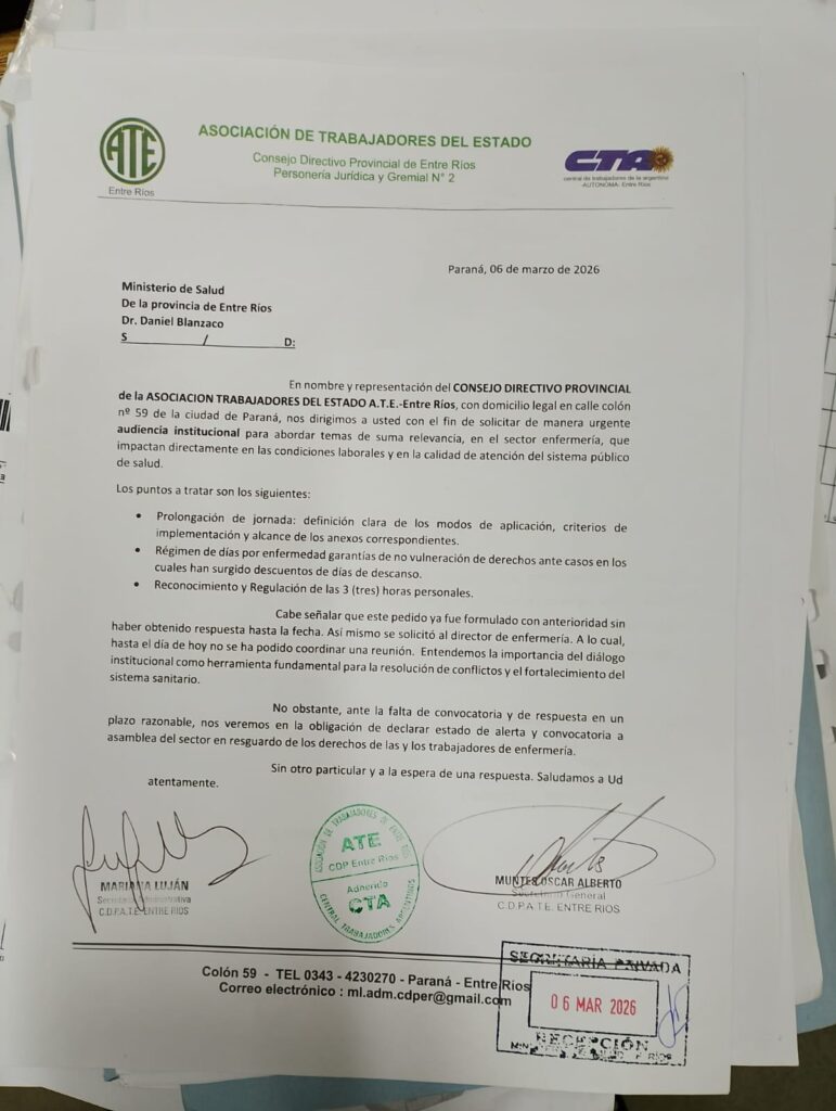 El Consejo Directivo Provincial de ATE Entre Ríos presentó, el viernes pasado, una nota formal solicitando audiencia urgente con el ministro de salud, Daniel Blanzaco, para abordar problemáticas que afectan directamente a las y los trabajadores de enfermería.